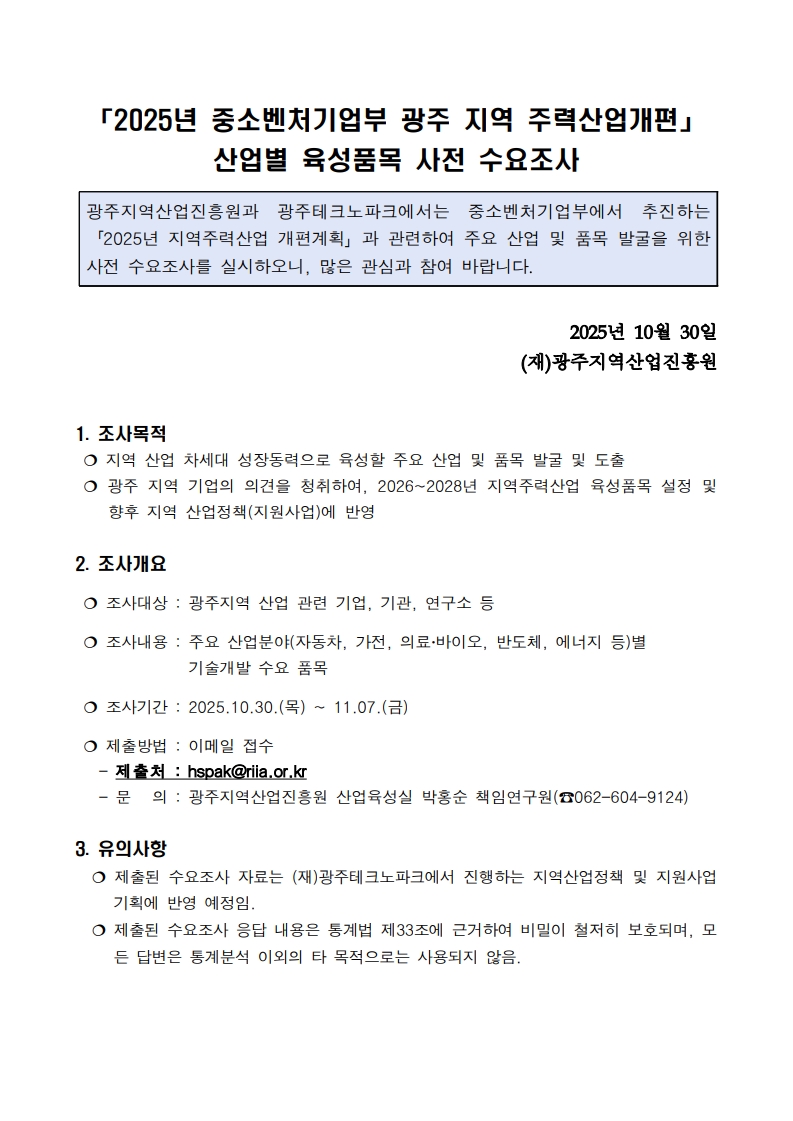 「2025년 중소벤처기업부 광주 지역 주력산업개편」 산업별 육성품목 사전 수요조사 공고